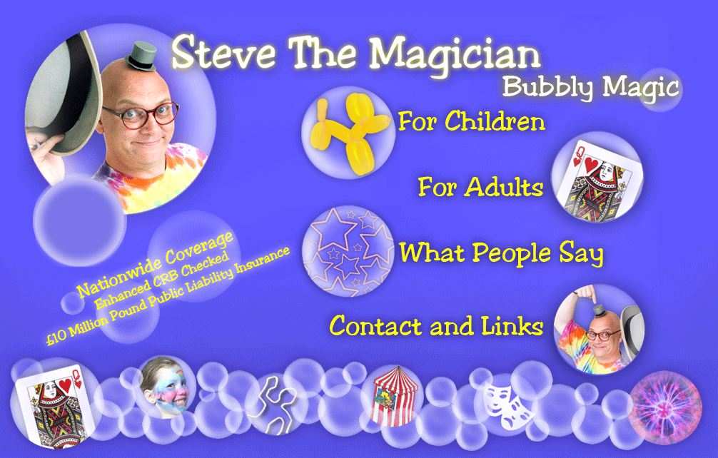 Steve the Magician Northampton your favourite children's entertainer Steve the Magician aka Mr Bubbles is a world class children's and adult entertainer based in Northampton, Northamptonshire he has been delighting audiences with his acts for many years. With an enhanced crb check and public liablitly insurance he is the ideal choice for you or your childs birthday party. |